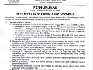 PENGUMUMAN Nomor : 0741/In.08/R/PP.00.9/02/2021 PENDAFTARAN BEASISWA BANK INDONESIA Diumumkan kepada seluruh mahasiswa Institut Agama Islam Negeri (IAIN) Syekh Nurjati Cirebon, tentang pendaftaran Beasiswa Bank Indonesia …[baca selengkapnya]