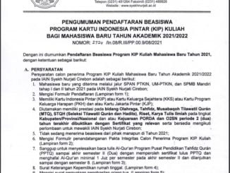 Link Pendaftaran Online http://kemahasiswaan.syekhnurjati.ac.id/ukt/r/pendaftaran-beasiswa-program-kartu-indonesia-pintar-kip-bagi-mahasiswa-baru-tahun-akademik-2021-2022. Unduh Pengumunan dan Lampiran Beasiswa KIP PENGUMUMAN PENDAFTARAN BEASISWA KIP 2021 Lampiran 1 Formulir Pendaftaran KIP Kuliah Angkatan 2021 Lampiran Lampiran …[baca selengkapnya]