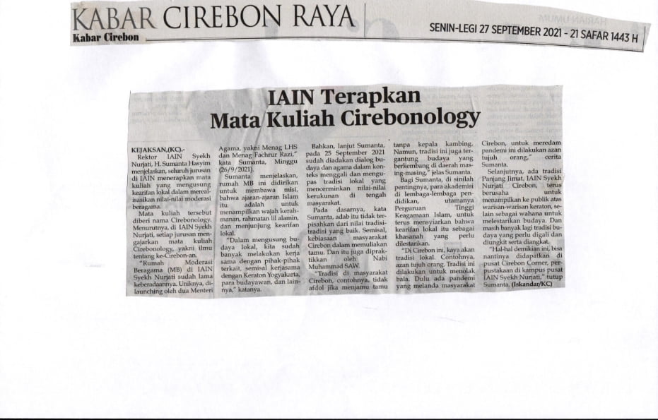 15 October 2021 • IAIN Terapkan Mata Kuliah Cirebonology (Kabar Cirebon/27 September 2021) IAIN Terapkan Mata Kuliah Cirebonology Kliping Digital