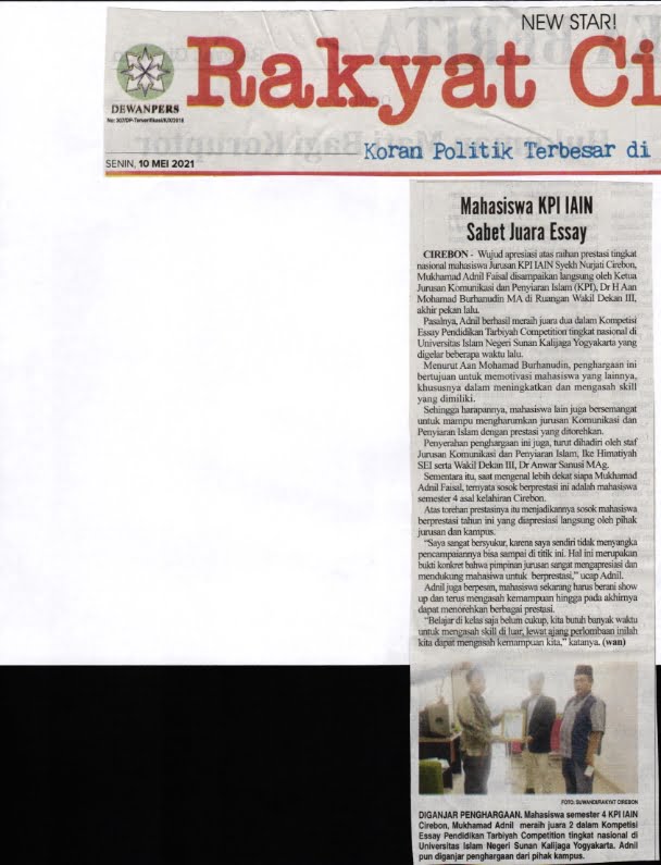 12 October 2021 • 1 Views • Mahasiswa KPI IAIN Sabet Juara Essay (Rakyat Cirebon/10 Mei) Mahasiswa KPI IAIN Sabet Juara Essay Kliping Digital
