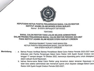 Panitia Seleksi (Pansel) Bakal Calon (Balon) Rektor IAIN Syekh Nurjati Cirebon mengadakan kegiatan Pemaparan Visi dan Misi 9 (sembilan) Balon Rektor IAIN Syekh Nurjati …[baca selengkapnya]
