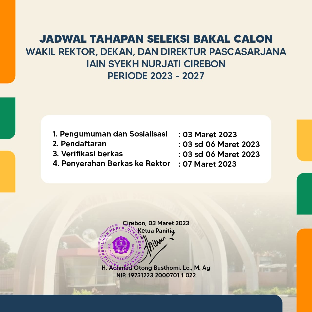 3 March 2023 • 2 Views • Pengumuman Pemilihan Bakal Calon Wakil Rektor, Dekan dan Direktur Pascasarjana IAIN Syekh Nurjati Cirebon Periode 2023-2027 Unduh Pengumuman link dibawah ini Pengumuman pemilihan warek dekan direktur_form Bakal Calon Rektor Pascasarjana Pengumuman