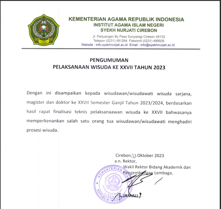 23 October 2023 • 1 Views • PENGUMUMAN PELAKSANAAN WISUDA TAHUN 2023 UNDUH PENGUMUMAN PELAKSANAAN WISUDA XXVII ORANG TUA10232023105602 Pengumuman