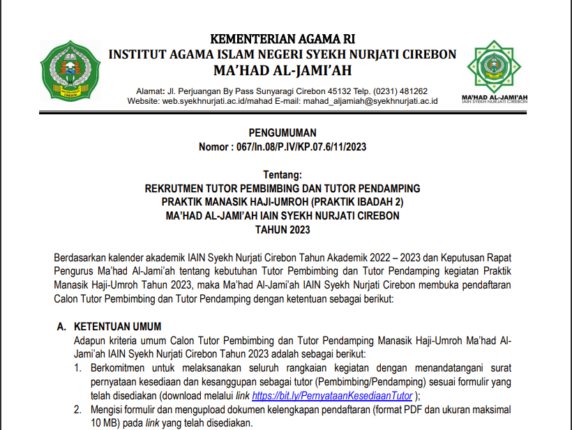 8 November 2023 • Pengumuman Rekrutmen Tutor Pembimbing dan Pendamping Praktek Manasik Haji dan Umroh Ma’had Al Jami’ah IAIN Syekh Nurjati Cirebon Rekrutmen Tutor Manasik Haji 2023 Pengumuman