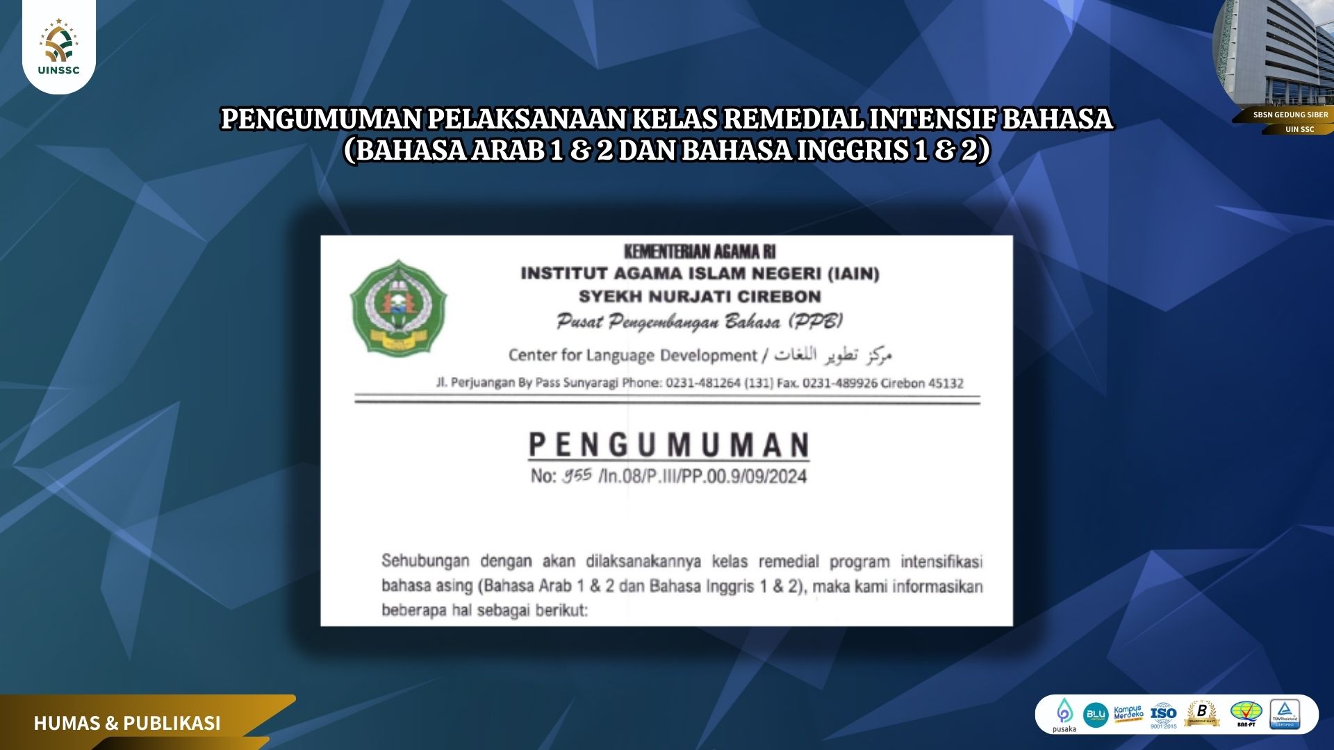 1 October 2024 • 1 Views • PENGUMUMAN PELAKSANAAN KELAS REMEDIAL INTENSIF BAHASA (BAHASA ARAB 1 & 2 DAN BAHASA INGGRIS 1 & 2) Untuk Informasi Selengkapnya Silahkan Unduh Link dibawah ini: PENGUMUMAN REMEDIAL 2024 Informasi Pengumuman