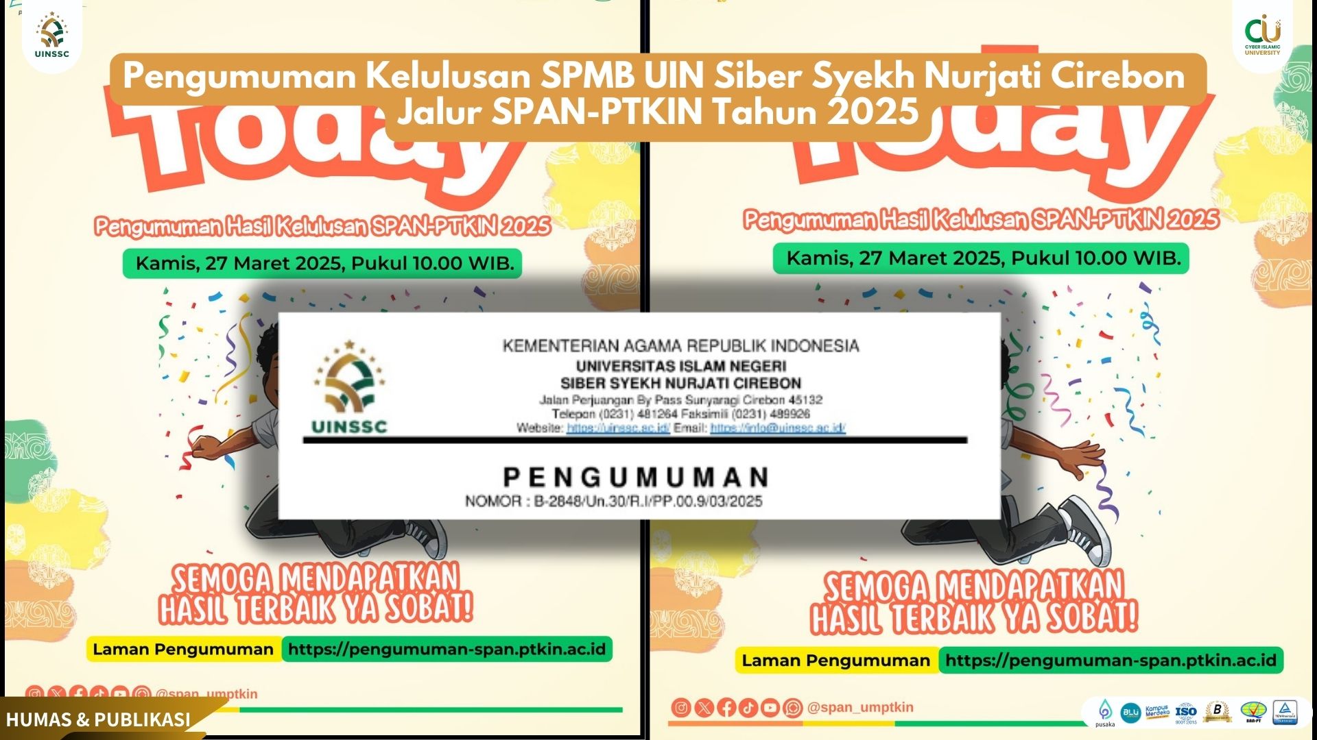 27 March 2025 • 5 Views • Pengumuman Kelulusan SPMB UIN Siber Syekh Nurjati Cirebon Jalur SPAN-PTKIN Tahun 2025 Untuk Informasi Selengkapnya Silahkan Unduh Link dibawah ini: Pengumuman SPAN-PTKIN 2025 Tata Cara Daftar Ulang... Pengumuman
