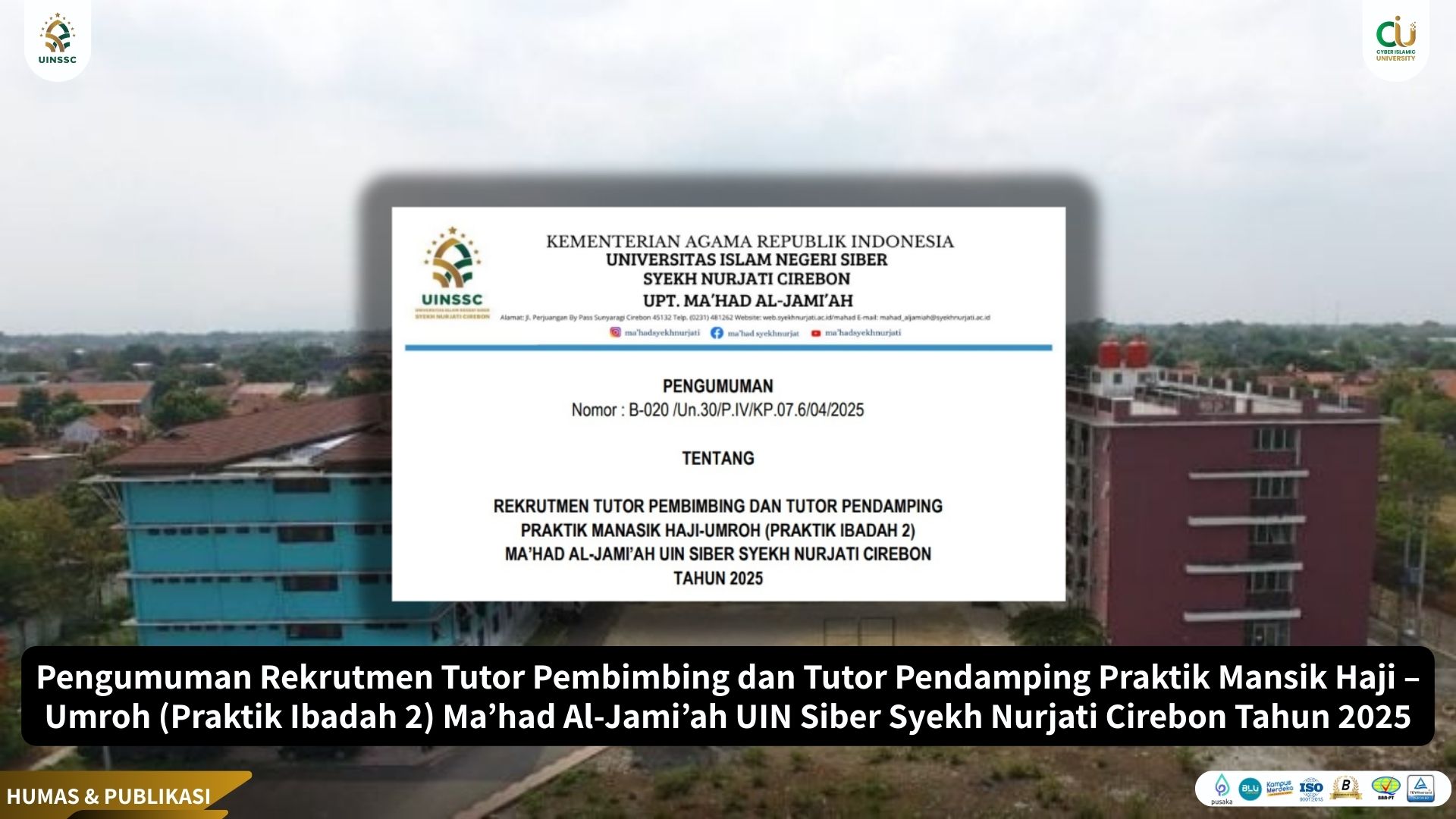 2 May 2025 • 3 Views • Pengumuman Rekrutmen Tutor Pembimbing dan Tutor Pendamping Praktik Mansik Haji – Umroh (Praktik Ibadah 2) Ma’had Al-Jami’ah UIN Siber Syekh Nurjati Cirebon Tahun 2025 Berdasarkan kalender akademik UIN Siber Syekh Nurjati Cirebon Tahun Akademik 2024 – 2025 dan Keputusan... Pengumuman