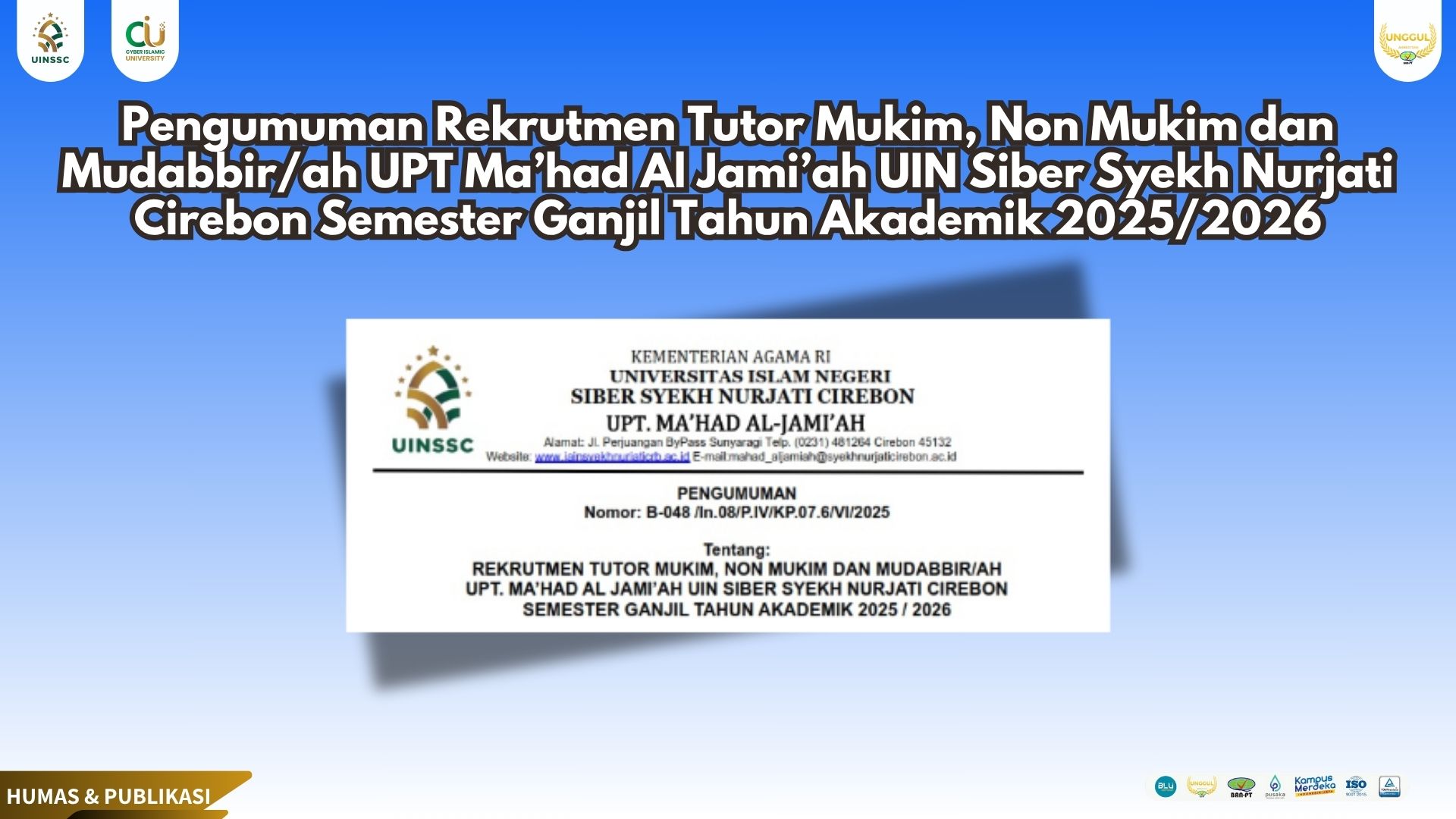 21 June 2025 • 3 Views • Pengumuman Rekrutmen Tutor Mukim, Non Mukim dan Mudabbir/ah UPT Ma’had Al Jami’ah UIN Siber Syekh Nurjati Cirebon Semester Ganjil Tahun Akademik 2025/2026 Untuk Informasi Selngkapnya Silahkan Unduh Link Dibawah ini: Rekrutmen tutor&mudabir-oh Ganjil 25-26 Pengumuman
