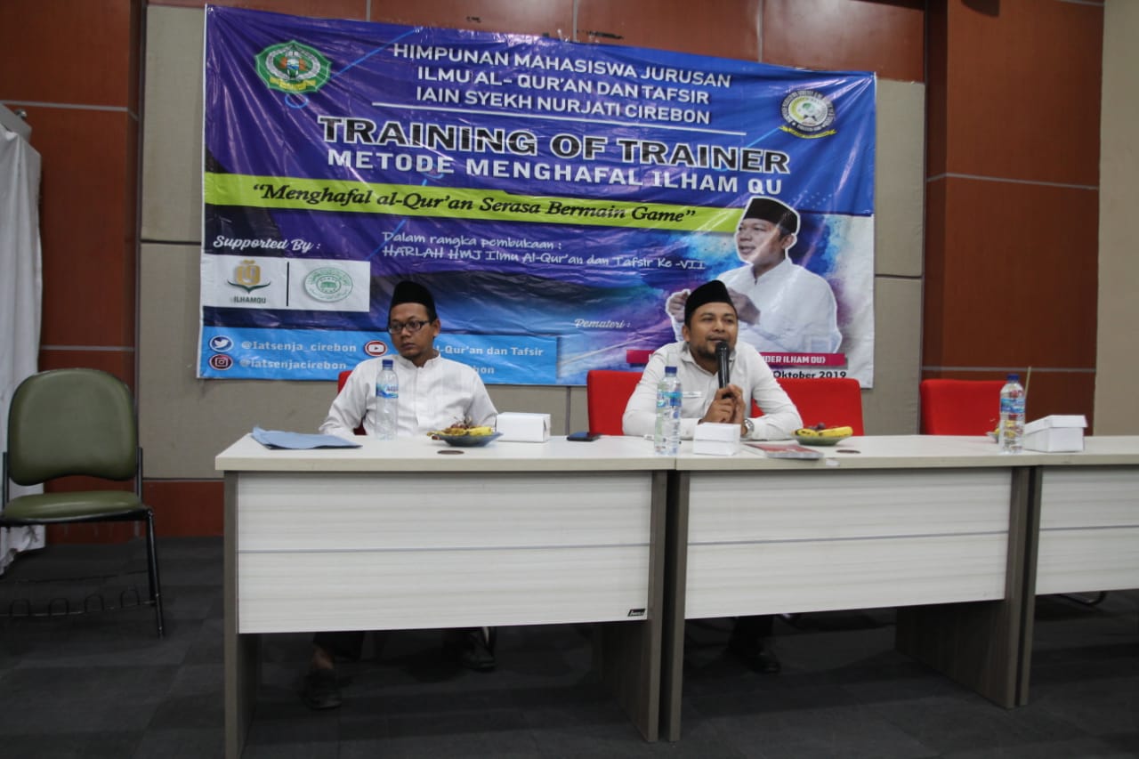 Himpunan Mahasiswa Jurusan Ilmu Al-Quran dan Tafsir (HIMA IQTAF) IAIN Syekh Nurjati Cirebon menggelar Pelatihan Menghafal Al-Quran dengan Metode Bermain Game di Gedung Auditorium Fakultas Ushuluddin Adab dan Dakwah (FUAD). Ustadz Ahmad Firdaus dan Ustadz M Mahdi Mujtahid (Pengurus Jam’iyyatul Qurra Wal Huffadh -JQH Kabupaten Cirebon) dihadirkan sebagai narasumber. Ketua HIMA IQTAF, Fitriyan Fauziah mengatakan, kegiatan bertujuan mempermudah mahasiswa menghafalkan Al-Qur’an. Pasalnya, metode yang digunakan mudah dan praktis. Apalagi mahasiswa Jurusan Ilmu Al-Quran dan Tafsir (IAT), lanjut Fitriyah, memang membidangi kajian Al-Quran. “Kerena menghafal Al-Quran merupakan sumber utama atau langkah awal dalam memahami Al-Quran secara utuh,” ungkapnya kepada Rakyat Cirebon. Senin (14/10/2019).
