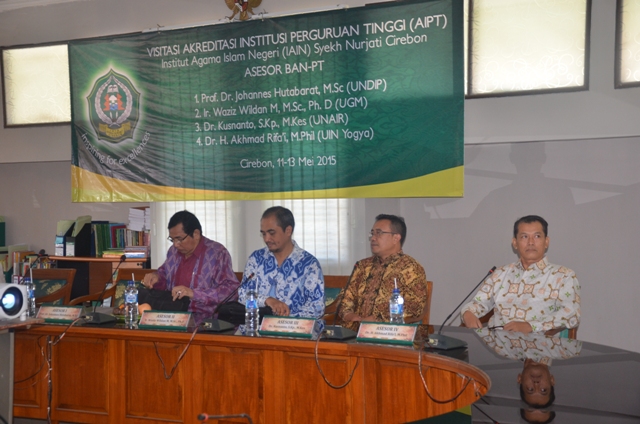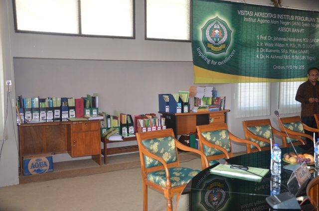GUDEP PRAMUKA IAIN Syekh Nurjati Cirebon menyambut tamu Tim Asesor BAN-PT. Dr. Septi Gumiandari, M. Ag menyambut kedatangan Tim Asesor BAN-PT. Dr. Anwar Sanusi, M. Ag menyambut Prof.Dr. Johannes Hurabarat, M.Sc dan Dr. H. Akhmad Rifa’i, M. Phil. Dr. Kusnanto, S.Kp., M. Kes dan Ir. Waziz Wildan M, M. Sc. Rektor IAIN menyambut Tim Asesor BAN-PT di ruang kerja beliau. Dokumen-dokumen yang disiapkan oleh Tim Gugus Mutu LPM. Rektor IAIN membuka acara Visitasi Akreditasi Institusi Perguruan Tinggi (AIPT) Tim Asesor BAN-PT Pejabat Rektorat hadir dalam acara AIPT Tahun 2015. Dr. Septi Gumiandari, M. Ag menyampaikan prolog kegiatan di depan Tim Asesor dan peserta. Tim Gusus Mutu Siap membantu dalam hal dokumen yag dibutuhkan oleh Tim Asesor BAN-PT.