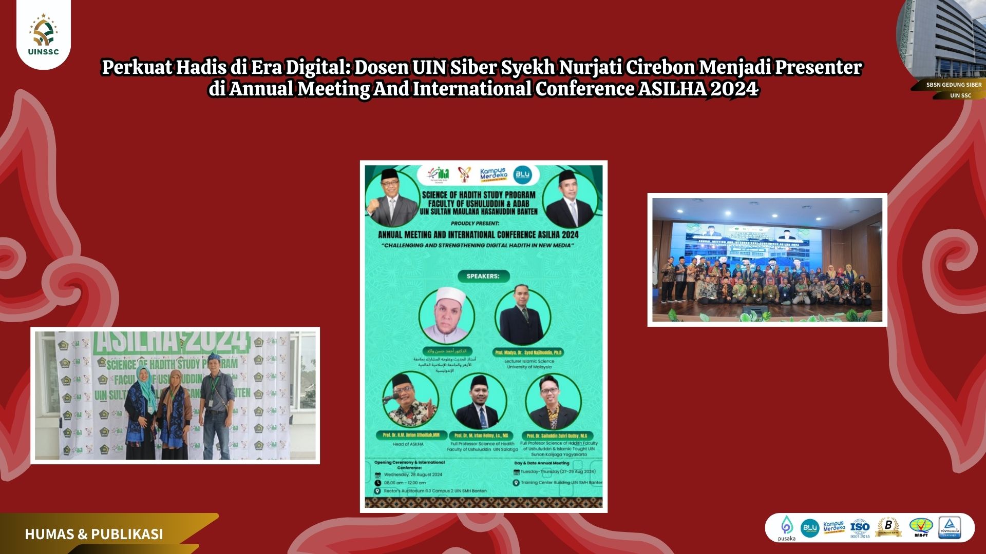 29 August 2024 • Perkuat Hadis di Era Digital: Dosen UIN Siber Syekh Nurjati Cirebon Menjadi Presenter di Annual Meeting And International Conference ASILHA 2024 UIN Siber Cirebon (Banten) – Konferensi Internasional dan Pertemuan Tahunan Asosiasi Ilmu Hadis Indonesia (ASILHA)... Berita