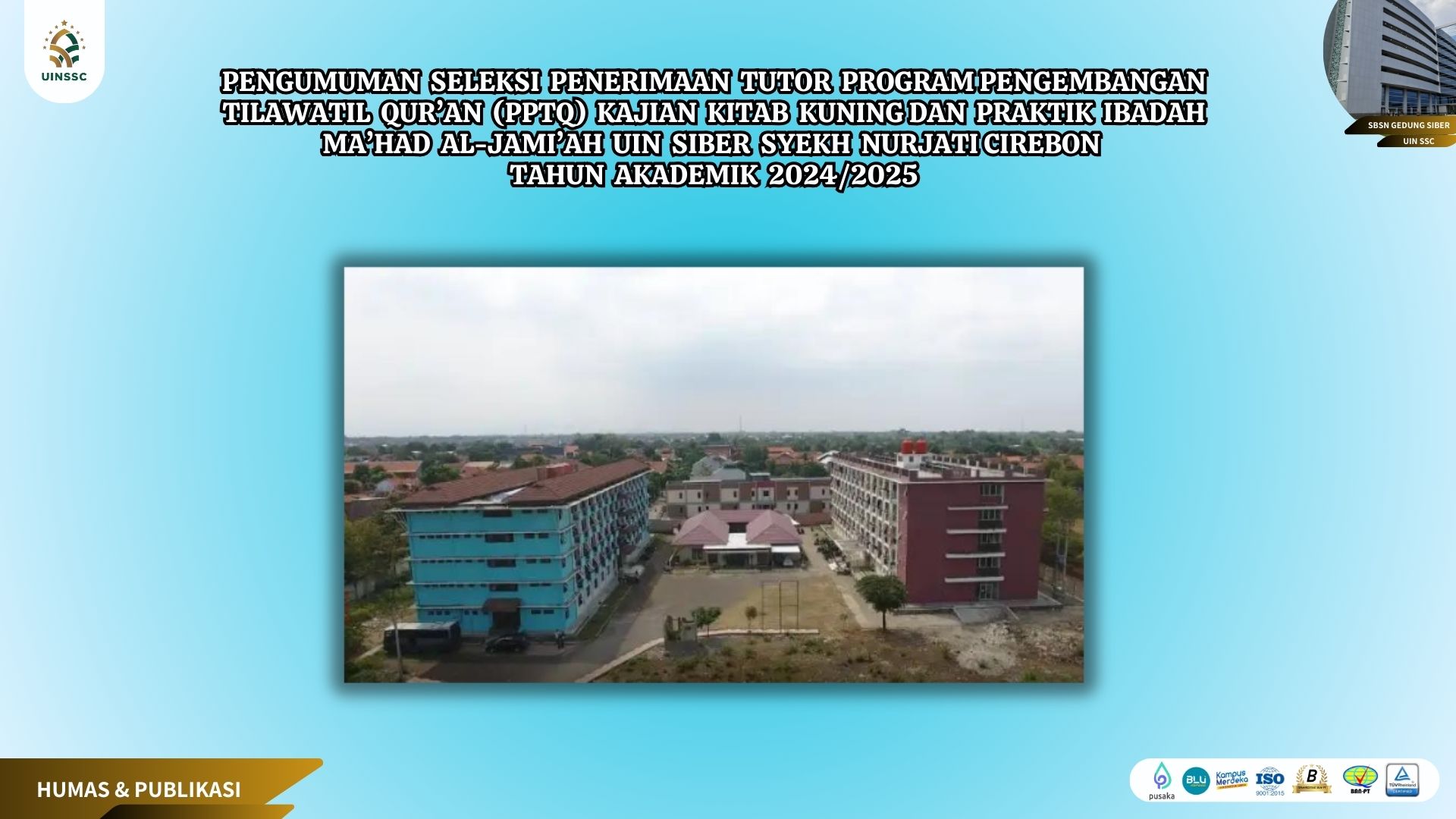 26 August 2024 • 1 Views • PENGUMUMAN SELEKSI PENERIMAAN TUTOR PROGRAM PENGEMBANGAN TILAWATIL QUR’AN (PPTQ) KAJIAN KITAB KUNING DAN PRAKTIK IBADAH MA’HAD AL-JAMI’AH IAIN SYEKH NURJATI CIREBON TAHUN AKADEMIK 2024/2025 Untuk Informasi Selengkapnya Silahkan Unduh Link dibawah ini : Rekrutmen Tutor Mahad Al-Jamiah UIN SSC... Informasi Pengumuman