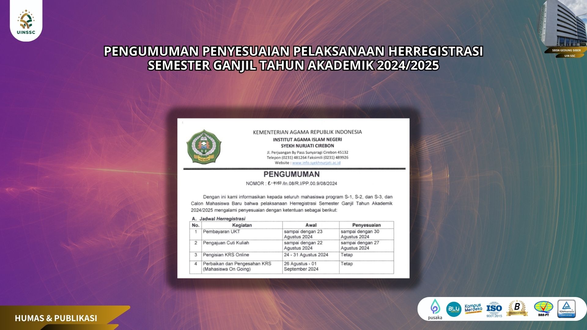 23 August 2024 • Pengumuman Penyesuaian Pelaksanaan Herregistrasi Semester Ganjil Tahun Akademik 2024/2025 Untuk Informasi Selengkapnya Silahkan Unduh Link dibawah ini : B-4030_Pengumuman Penyesuaian Pelaksanaan Herregistrasi Semester Ganjil... Informasi Pengumuman