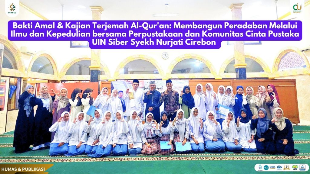 UIN Siber Cirebon, 21 Februari 2025 – Dalam semangat kebersamaan menyambut bulan suci Ramadhan dan kecintaan terhadap Al-Qur’an, Komunitas Cinta Pustaka Universitas Islam Negeri Siber Syekh Nurjati Cirebon, yang juga dikenal dengan Cyber Islamic University (CIU), berkolaborasi dengan Perpustakaan UIN Siber Syekh Nurjati Cirebon dan Dewan Kemakmuran Masjid (DKM) Masjid Jami’ Al-Munawwarah dalam menyelenggarakan Bakti Literasi & Kajian Terjemah Al-Qur’an bertajuk “Membangun Peradaban Melalui Ilmu dan Kepedulian”. Bertempat di Masjid Jami’ Al-Munawwarah, Kota Cirebon, acara ini sukses mempertemukan masyarakat, pelajar, dan akademisi dalam satu momen penuh inspirasi dan kepedulian sosial.