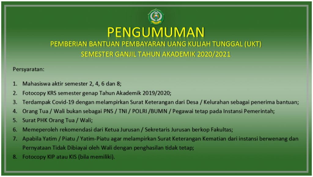 Sehubungan dengan terjadinya Pandemi Covid-19 pada tahun 2020, dengan ini kami sampaikan pemberitahuan kepada seluruh mahasiswa IAIN Syekh Nurjati Cirebon tentang pengajuan pemberian bantuan pembayaran Uang Kuliah Tunggal (UKT) Semester Ganjil Tahun Akademik 2020/2021 dengan ketentuan sebagai berikut: