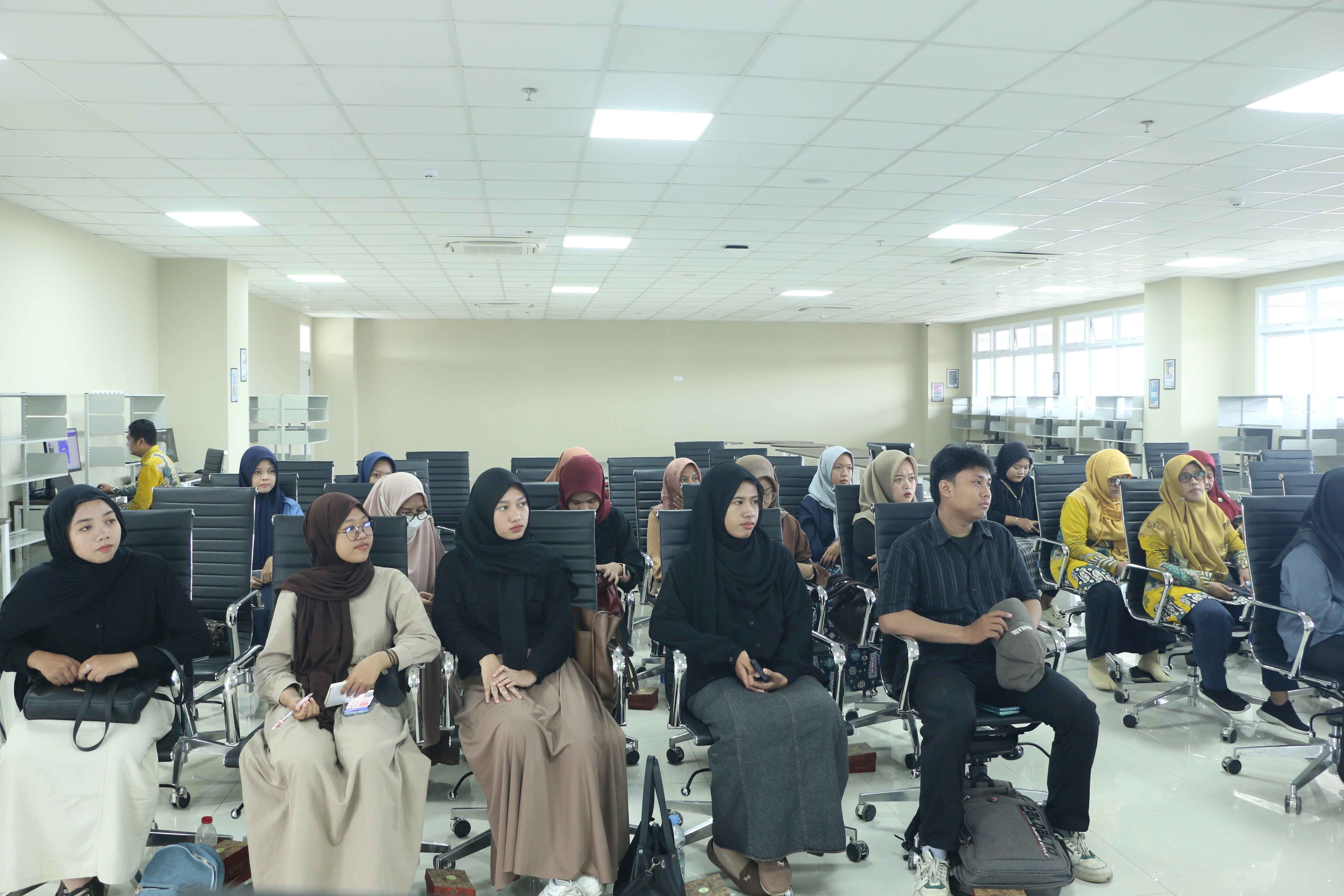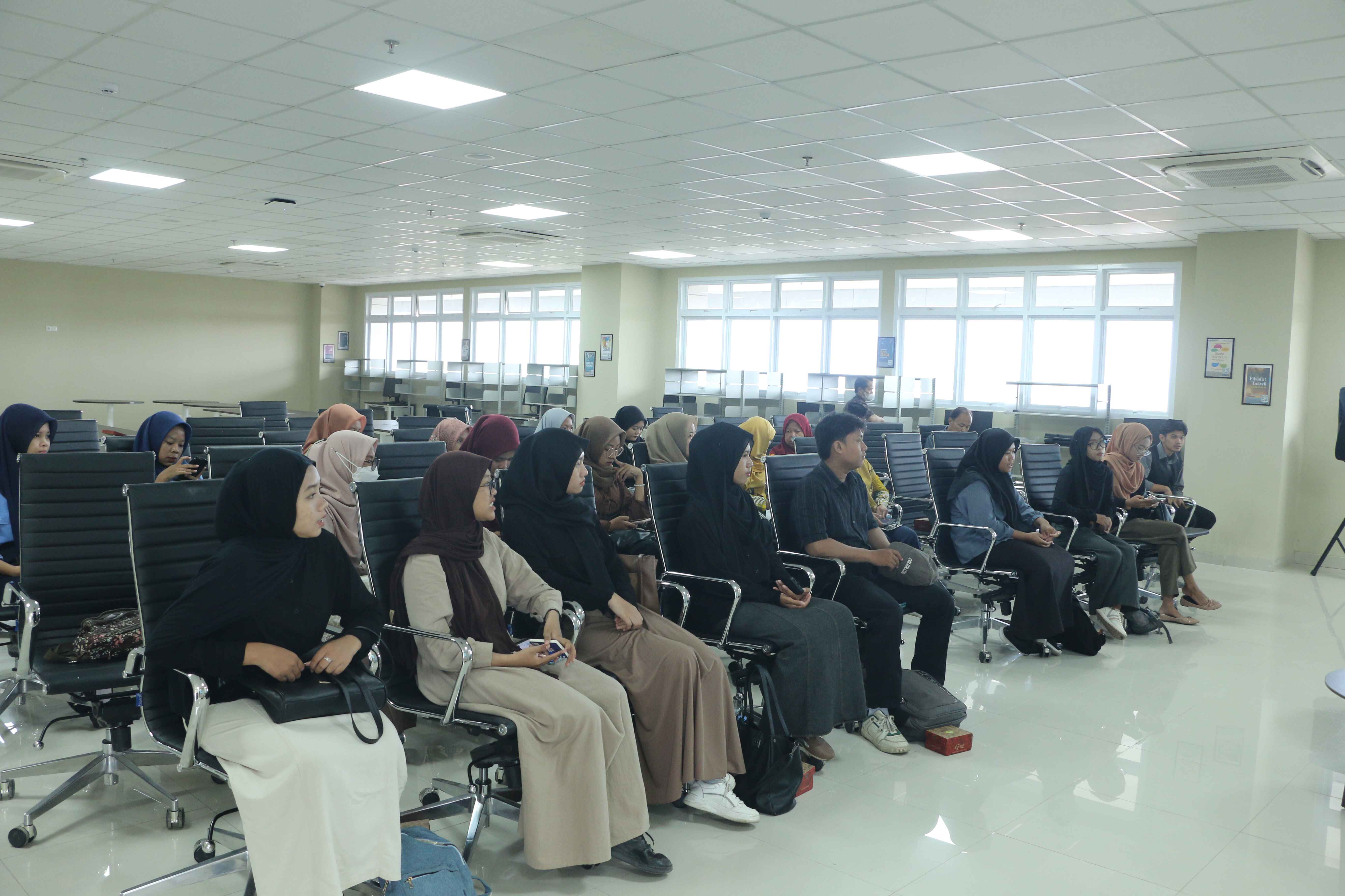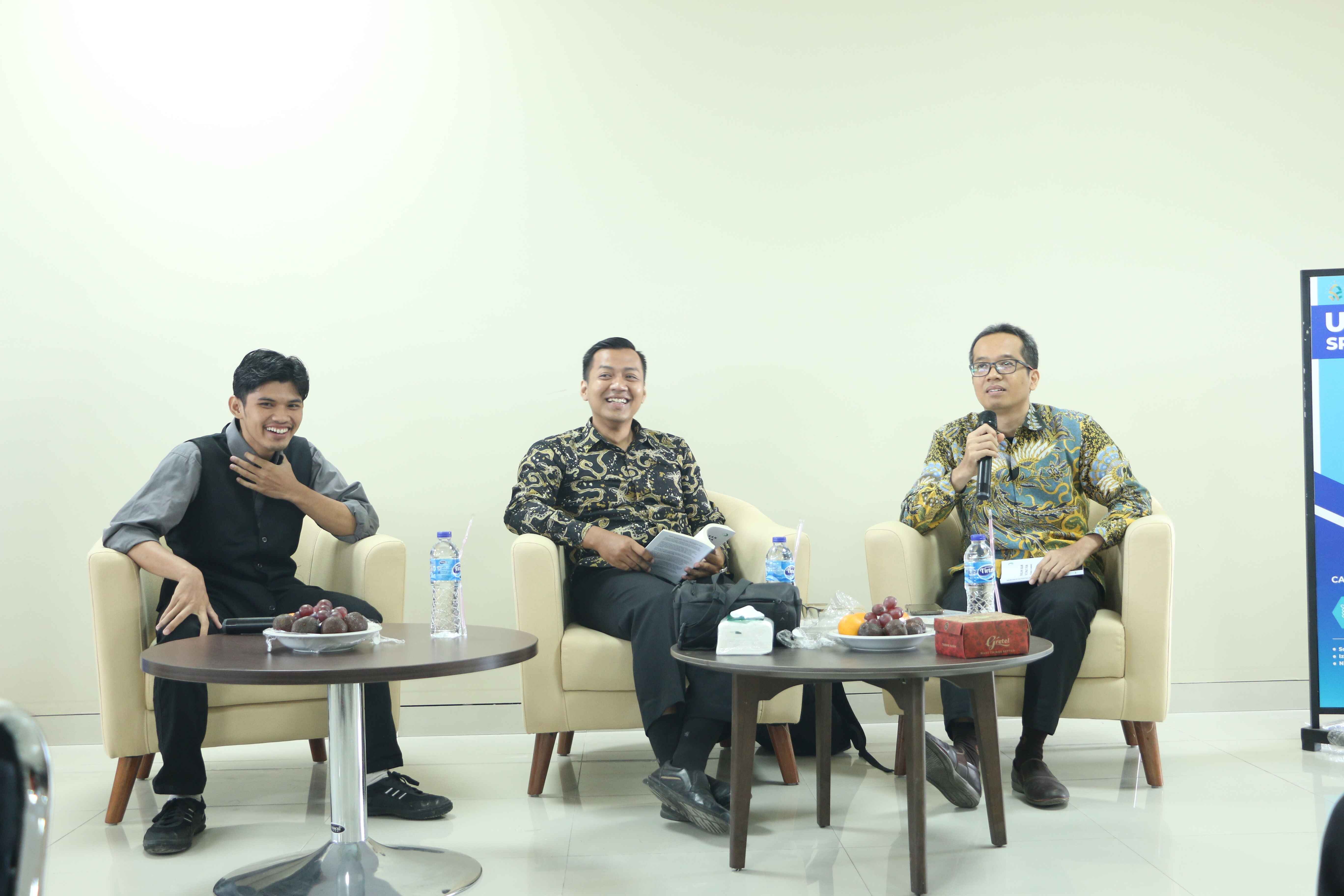 Dengan gaya pembawaannya yang energik, Rifaldi berhasil menghubungkan narasumber utama, Dr. Budi Manfaat, M.Si., dan pembanding, Muhamad Hidayat, S.Pd.I., M.Stat., dengan audiens dari berbagai kalangan, termasuk dosen, mahasiswa lintas program studi, komunitas perpustakaan, dan tamu undangan.