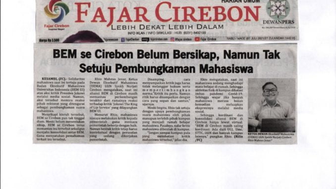 BEM Se-Cirebon Belum Bersikap Namun Tak Setuju Pembungkaman Mahasiswa (Fajar Cirebon/7 Juli 2021) 13 Oktober 2021 arifin Kliping Digital 0 BEM Se-Cirebon Belum Bersikap Namun Tak Setuju Pembungkaman Mahasiswa