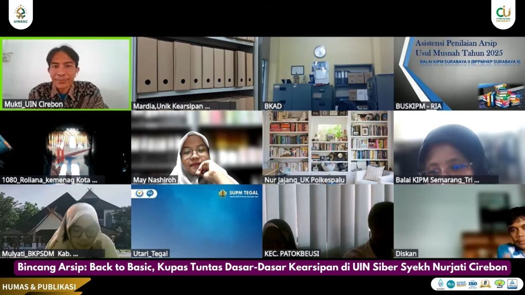 UIN Siber Cirebon — Mengawali tahun 2025 dengan semangat profesionalisme dan penguatan tata kelola informasi, Kelompok Fungsional Arsiparis UIN Siber Syekh Nurjati Cirebon sukses menyelenggarakan kegiatan Bincang Arsip bertajuk “Back to Basic” dengan subtema “Dasar-Dasar Kearsipan”, pada Rabu (07/05). Kegiatan ini dilaksanakan secara daring melalui platform Zoom Meeting dan mendapat respons luar biasa dari peserta di seluruh Indonesia.
