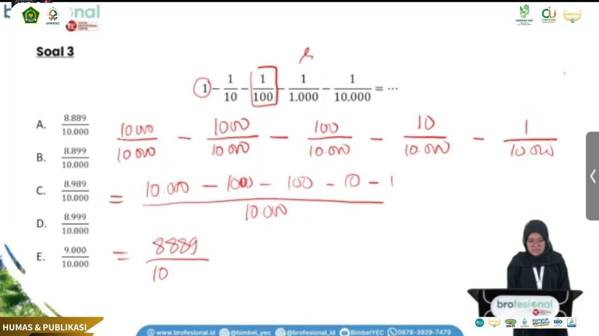 Sesi yang berlangsung intensif pukul 18.30–20.00 WIB ini dipandu oleh Coach Ika Agustina Fitriani, S.Pd., pakar numerik dengan latar belakang Sarjana Pendidikan Matematika FMIPA Universitas Negeri Yogyakarta (UNY) dan saat ini menempuh Magister Pendidikan Matematika di institusi yang sama. Sebagai Chief of Academic and Operational Department Brofesional, Coach Ika membawa pengalaman mengajar lebih dari enam tahun dalam membimbing peserta menghadapi berbagai jenis tes numerik.