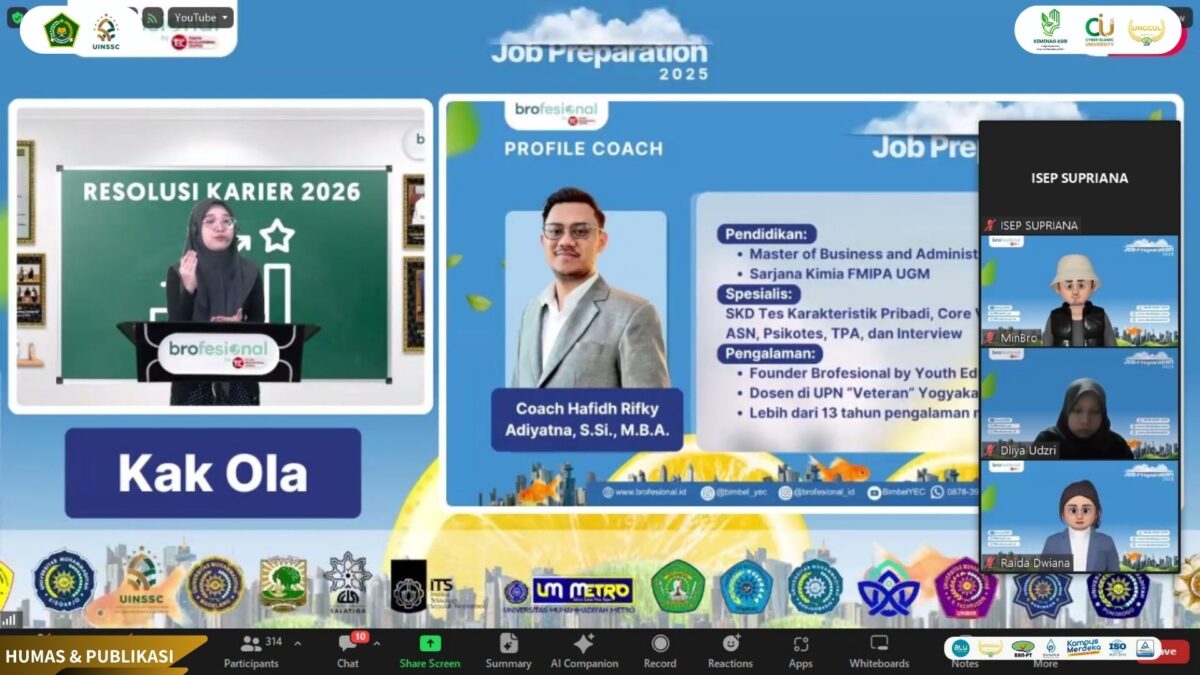 UIN Siber Cirebon – Rangkaian program bimbingan karir hasil kolaborasi antara Brofesional dan Career Development Center (CDC) UIN Siber Syekh Nurjati Cirebon kembali berlanjut. Pada sesi kedua, yang diselenggarakan pada Kamis, 4 Desember 2025, peserta mendapatkan penguatan materi strategis dari Coach Hafidh Rifky Adiyatna, S.Si., M.B.A., dengan fokus utama pada penyusunan Rencana Karir (Career Plan) yang tepat sasaran.