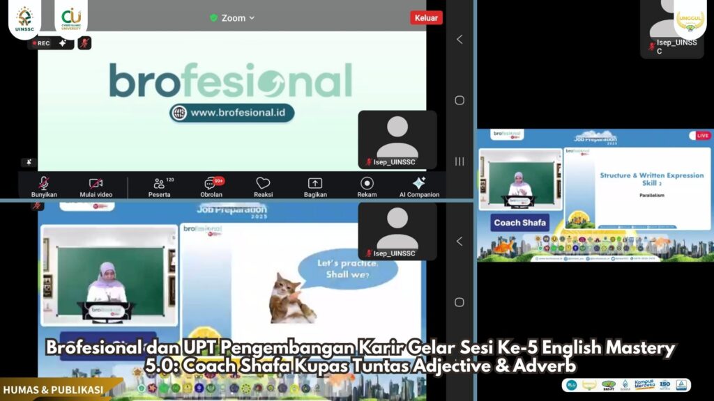 UIN Siber Cirebon – Brofesional dan Unit Pelaksana Teknis (UPT) Pengembangan Karir kembali menunjukkan komitmennya dalam meningkatkan kompetensi generasi muda melalui gelaran sesi kelima program English Mastery 5.0. Dalam sesi yang digelar Selasa ini, peserta mendapat pelatihan eksklusif dari Coach Shafa, S.S., yang dikenal dengan pendekatan interaktif dan materinya yang aplikatif.(22/07).