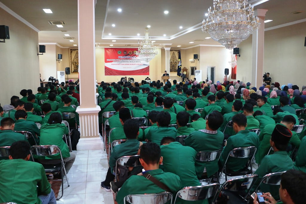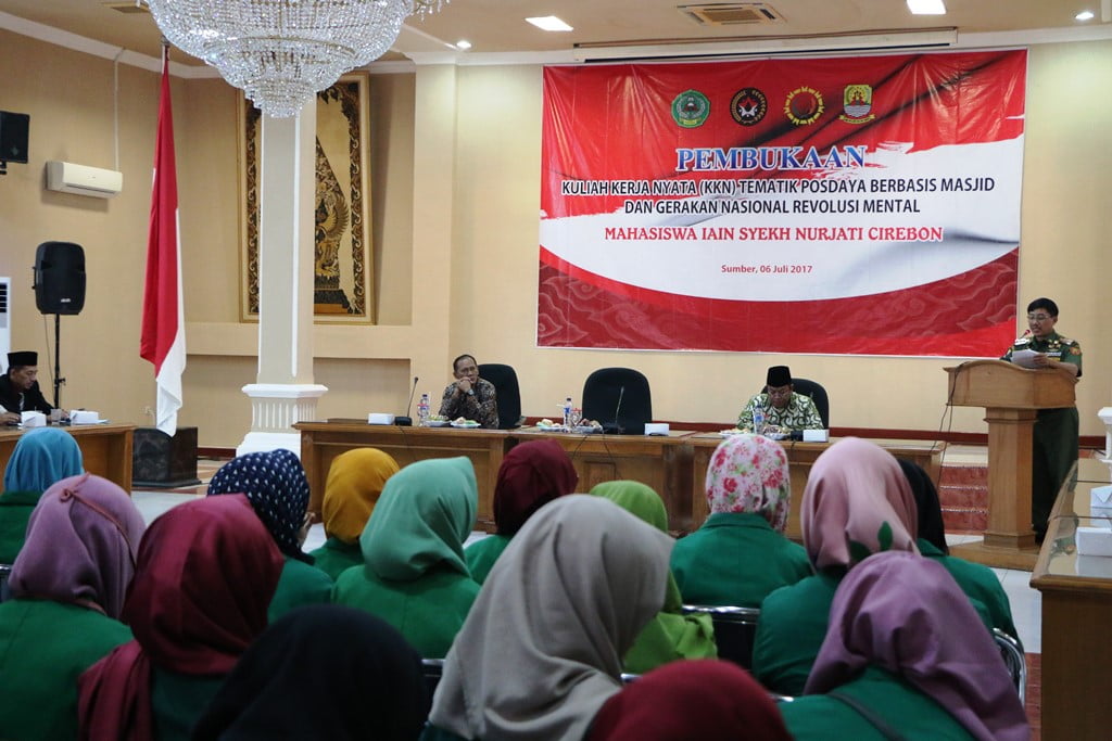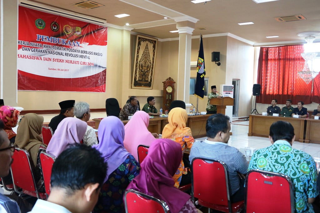 Pemerintahan Kabupaten Cirebon (Pemkab) menerima 1.462 mahasiswa IAIN Syekh Nurjati Cirebon yang akan melaksanakan kegiatan Kuliah Kerja Nyata (KKN) 40 hari kedepan. Penerimaan dilakukan langsung oleh Bupati Cirebon, Dr. H. Sunjaya Purwadisastra, MM.M.Si, yang di dampingi pejabat terkait, Kamis (6/7) di Ruang Nyi Mas Gandasari Setda Kabupaten Cirebon. KKN IAIN Syekh Nurjati Cirebon tahun ini akan di tempatkan di sembilan Kecamatan di wilayah Cirebon Timur hingga 14 Agustus mendatang. Dr. H. Wawan Ahmad Ridwan, M.Ag (Kepala Pusat Penelitian dan Pengabdian Masyarakat) menjelaskan maksud pelaksanaan KKN yaitu, untuk kepentingan mahasiswa meningkatkan kemampuan menyatu bersama masyarakat menerapkan ilmu agama terintegrasi dengan teknologi, seni dan budaya yang di pelajari secara langsung. Serta kepentingan keluarga dan masyarakat KKN Tematik Gerakan Revolusi Mental dan Posdaya untuk membantu pemberdayaan keluarga dan masyarakat melalui bidang keagamaan, pendidikan keterampilan, ekonomo/kewirausahaan, Kesehatan/KB dan lingkungan hidup untuk membangun, Budaya melayani, Budaya bersih, Budaya mandiri, Budaya tertib dan Budaya Gotong royong. Beliau juga menambahkan Tujuan Pelaksanaan KKN adalah Meningkatkan kepedulian dan kemampuan mahasiswa dalam mengatasi masaalah keluarga dan masyarakat serta melakasanakan pengembangan masyarakat melalui penyusunan rencana dan pendampingan pada pos Pemberdayaan kepada keluarga secara inovatif, kreatif melalui penerapan ilmu dan teknologi bersama masyarakat dan lembaga pedesaan lainnya, sehingga dapat meningkatkan Indeks Pembangunan Manusia (IPM) di Kabupaten Cirebon. KKN tahun ini mengemban dua Tema besa yaitu KKN Tematik Posdaya Berbasis Masjid dan Gerakan Nasional Revolusi Mental. Output dari pelaksanaak KKN ini adalah Meningkatkan kualitas mahasiswa serta adanya solusi yang bisa diambil oleh pemerintah dari permasalahan yang terjadi di masyarkat Kabupaten Cirebon.
