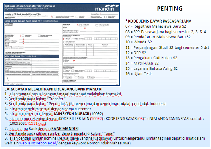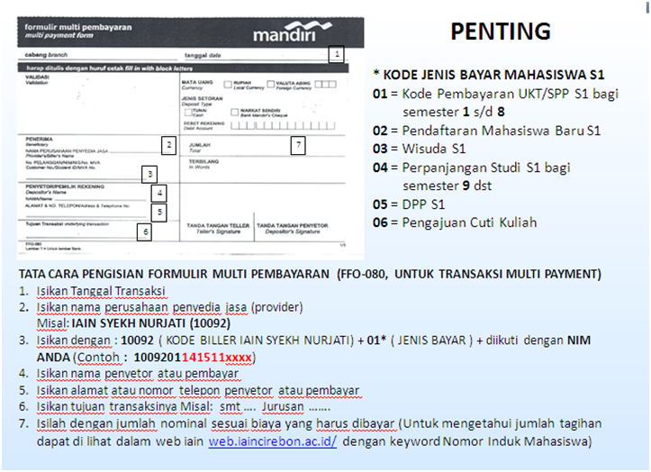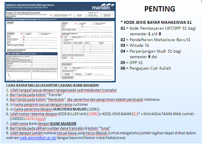 Pembayaran SPP/UKT Tahun Ajaran 2015/2016-2 hanya melalui Bank Mandiri. Cara pembayarannya dapat melalui ATM dan dapat pula dengan form yang ada di Bank Mandiri. Berikut ini tata cara pengisian formulir pembayaran uang kuliah