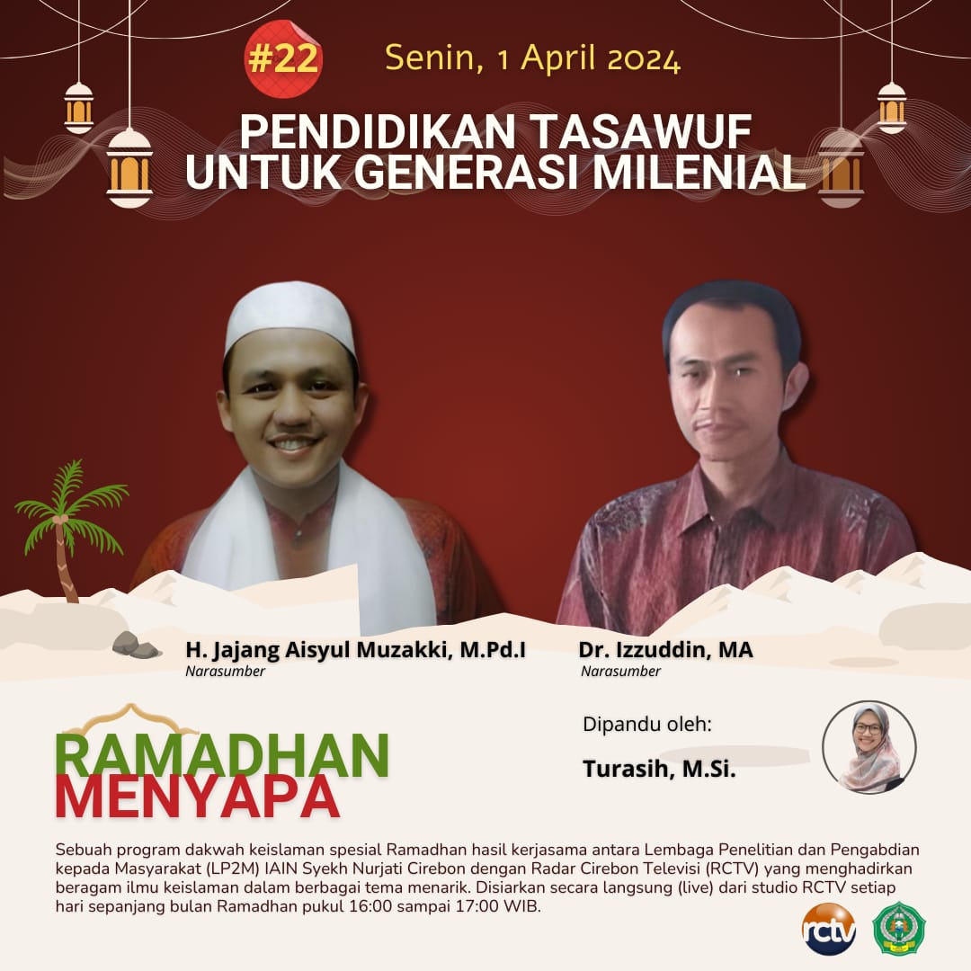 1 April 2024 • Ramadhan Menyapa: Menyelami Pendidikan Tasawuf untuk Generasi Milenial IAIN Cirebon – Cirebon. Program Ramadhan Menyapa hari ke-22 kembali menghiasi layar televisi dengan tema... Berita Informasi Kegiatan