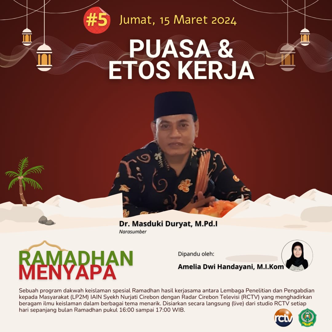 15 March 2024 • 1 Views • “Ramadhan Menyapa” Mengupas Keharmonisan Antara Puasa dan Etos Kerja IAIN Cirebon, – Kegiatan berkah “Ramadhan Menyapa” terus memancarkan sinar kebijaksanaan di tengah-tengah umat Islam.... Berita Informasi Kegiatan