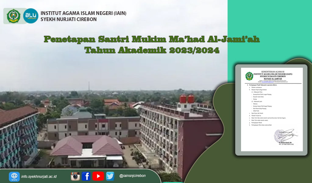14 August 2023 • Penetapan Santri Mukim Ma’had Al-Jami’ah Tahun Akademik 2023/2024 Berdasarkan Keputusan Rektor Institut Agama Islam Negeri Syekh Nurjati Cirebon Nomor : 689 Tahun 2023... Berita