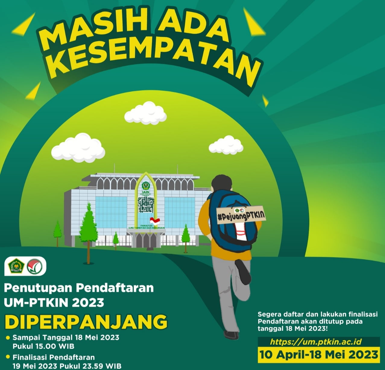 15 May 2023 • Pendaftaran UM-PTKIN Diperpanjang hingga 18 Mei 2023 Pendaftaran Ujian Masuk Perguruan Tinggi Keagamaan Islam Negeri (UM-PTKIN) diperpanjang hingga 18 Mei 2023. Hal... Berita