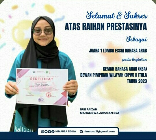 2 October 2023 • Nur Faizah Raih Juara 1 dalam Lomba Essai Bahasa Arab DPW II ITHLA IAIN Cirebon- Nur Faizah Mahasiswi semester 3 Jurusan Bahasa dan Sastra Arab Fakultas Ushuluddin dan... Berita Informasi