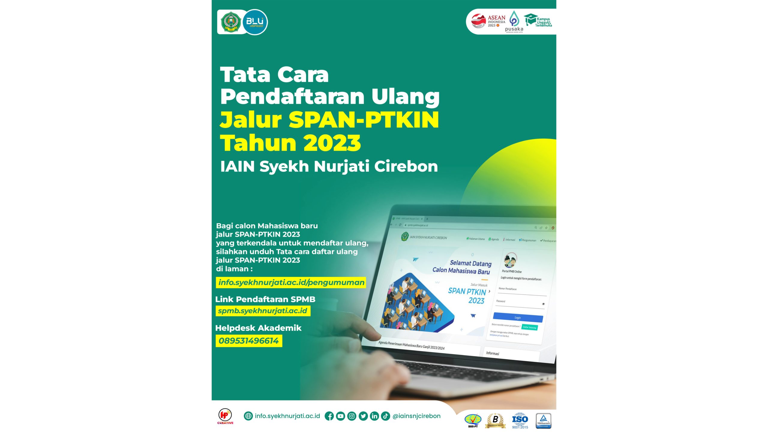 12 April 2023 • TATA CARA DAFTAR ULANG CALON MAHASISWA BARU JALUR SPAN-PTKIN 2023 Bagi calon Mahasiswa baru jalur SPAN-PTKIN 2023 yang terkendala untuk mendaftar ulang, silahkan unduh tata... Informasi Pengumuman
