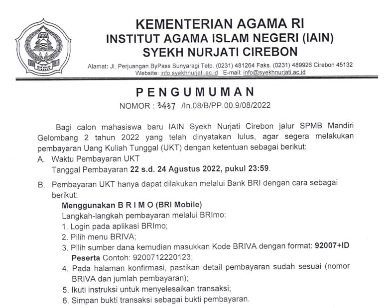 22 August 2022 • Pengumuman Pembayaran Uang Kuliah Tunggal (UKT) SPMB Jalur Mandiri Gelombang 2 IAIN Syekh Nurjati Cirebon Tahun Akademik 2022/2023 Unduh Pengumuman : PENGUMUMAN PEMBAYARAN UKT SPMB MANDIRI GEL 2 TAHUN 2022 Informasi Pengumuman