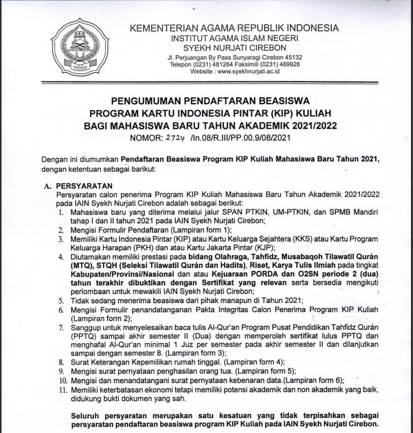 Link Pendaftaran Online http://kemahasiswaan.syekhnurjati.ac.id/ukt/r/pendaftaran-beasiswa-program-kartu-indonesia-pintar-kip-bagi-mahasiswa-baru-tahun-akademik-2021-2022. Unduh Pengumunan dan Lampiran Beasiswa KIP PENGUMUMAN PENDAFTARAN BEASISWA KIP 2021...