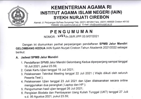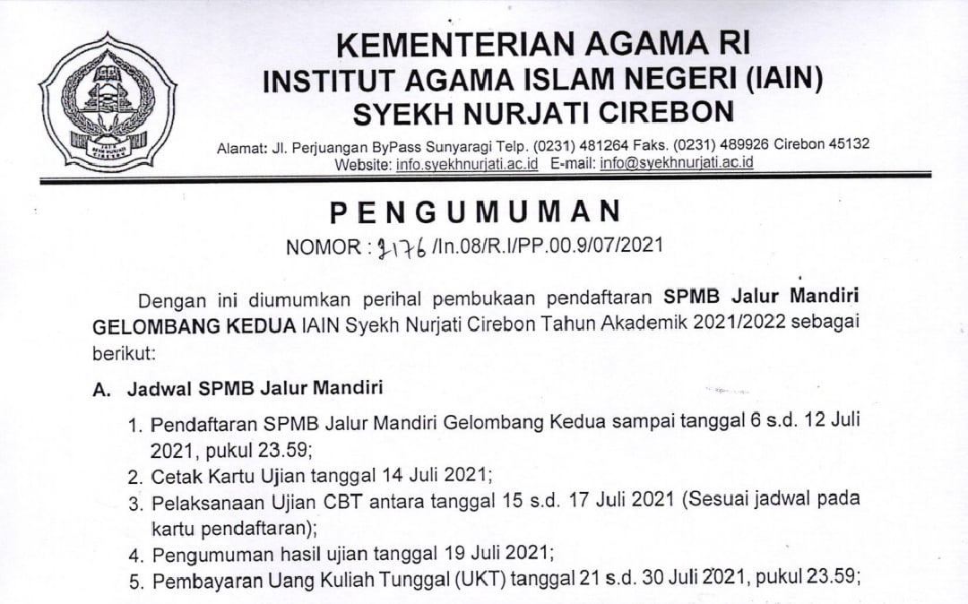 7 July 2021 • Pengumuman SPMB Mandiri Gelombang II IAIN Syekh Nurjati Cirebon tahun 2021 Unduh Pengumuman pengumuman spmb mandiri gel II 2021 revisi07062021170612 Informasi Pengumuman