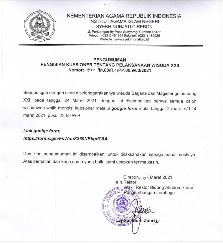 3 March 2021 • PENGUMUMAN PENGISIAN KUISIONER WISUDA XXII IAIN SYEKH NURJATI CIREBON LINK PENGISIAN KUISIONER WISUDA IAIN SYEKH NURJATI CIREBON XXII https://forms.gle/FnWouS369NBkgdC8A UNDUH PENGUMUMAN ND PENGUMUMAN KUESIONER... Informasi Pengumuman