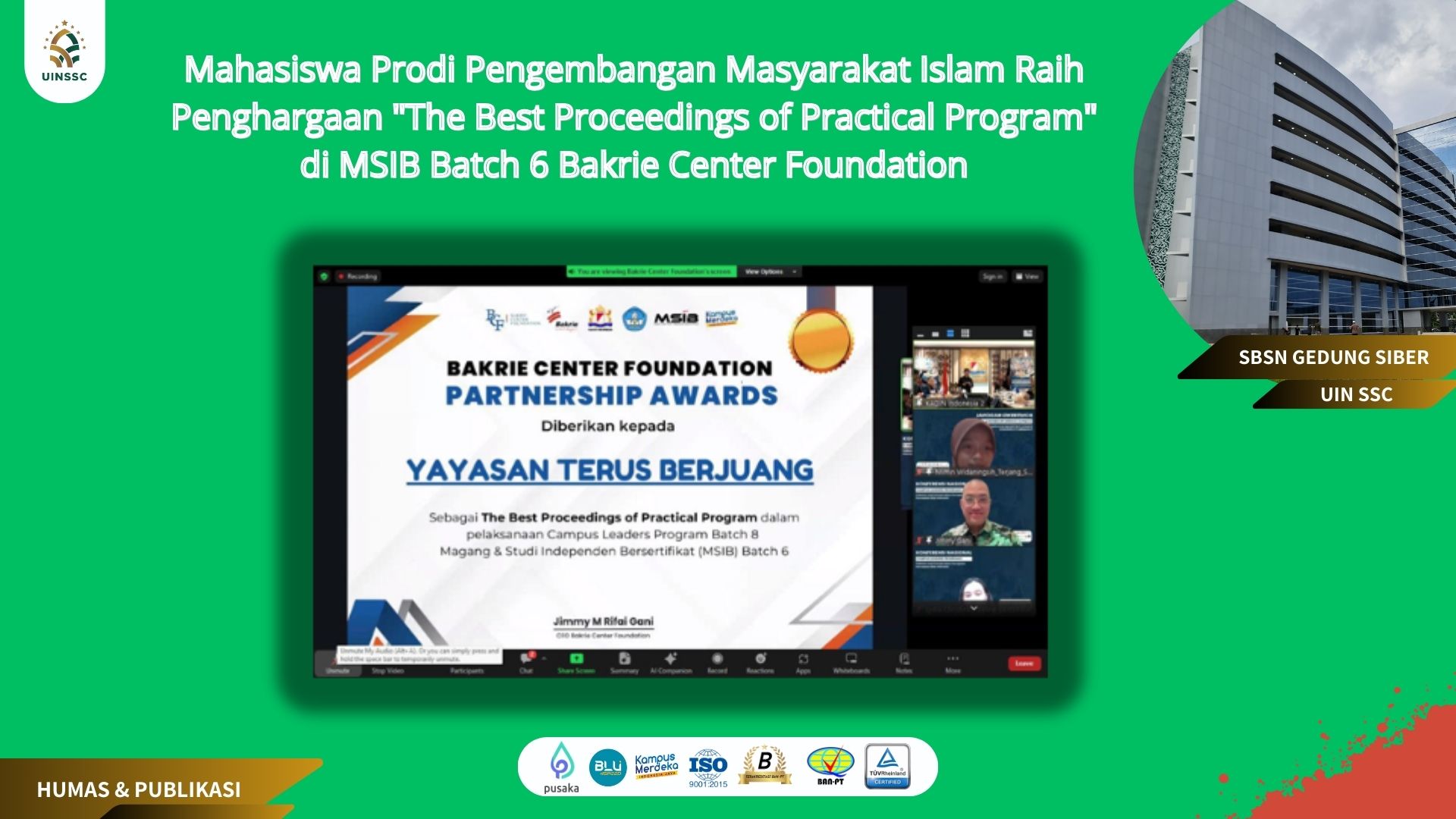 12 July 2024 • Mahasiswa Prodi Pengembangan Masyarakat Islam Raih Penghargaan “The Best Proceedings of Practical Program” di MSIB Batch 6 Bakrie Center Foundation UIN Siber Cirebon – Mimin Widaningsih, mahasiswa berprestasi dari Program Studi Pengembangan Masyarakat Islam (PMI),... Berita Kegiatan