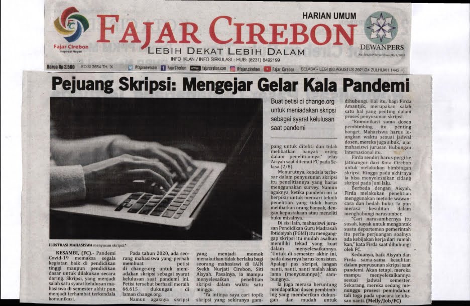 13 October 2021 • 7 Views • Pejuang Skripsi Mengejar Gelar Kala Pandemi (Fajar Cirebon/3 Agustus 2021) Pejuang Skripsi Mengejar Gelar Kala Pandemi Kliping Digital