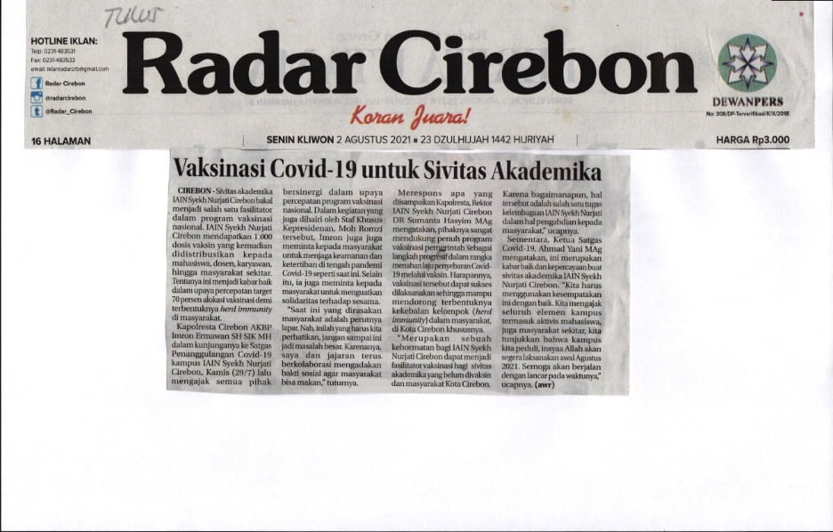 13 October 2021 • 1 Views • Vaksinasi Covid 19 untuk Sivitas Akademika (Radar Cirebon/2 Agustus 2021) Vaksinasi Covid 19 untuk Sivitas Akademika Kliping Digital