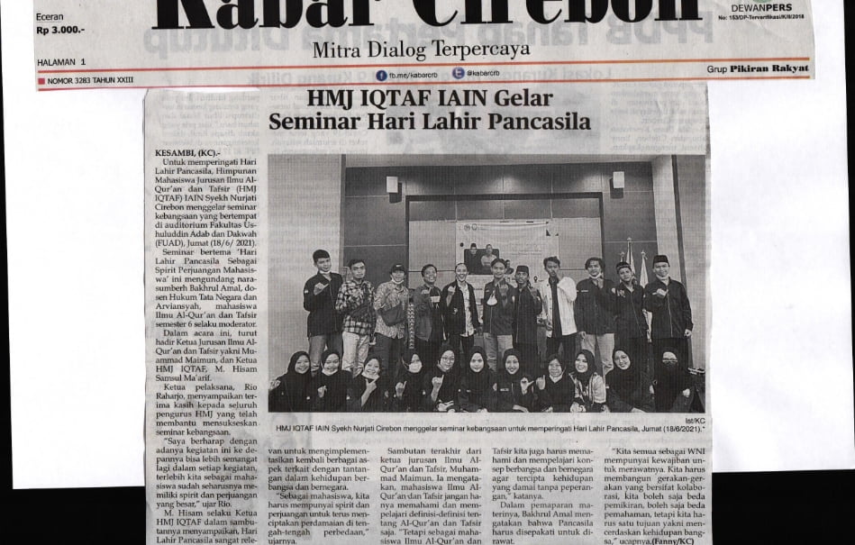 13 October 2021 • 1 Views • HMJ IQTAF Gelar Seminar Hari Lahir Pancasila (Kabar Cirebon/16 Juni 2021) HMJ IQTAF Gelar Seminar Hari Lahir Pancasila Kliping Digital