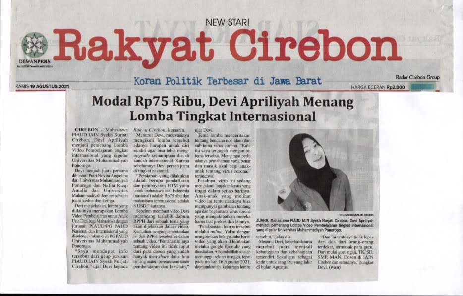 13 October 2021 • 1 Views • Modal Rp. 75 ribu, Devi Apriliyah Menang Lomba Tingkat Internasional (Rakyat Cirebon/19 Agustus 2021) Modal Rp. 75 ribu, Devi Apriliyah Menang Lomba Tingkat Internasional Kliping Digital
