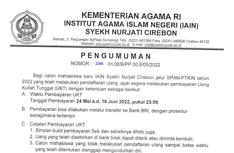 21 May 2022 • Pengumuman Pembayaran UKT Jalur SPAN-PTKIN UNDUH DOKUMEN PENGUMUMAN PEMBAYARAN UKT SPAN Pengumuman