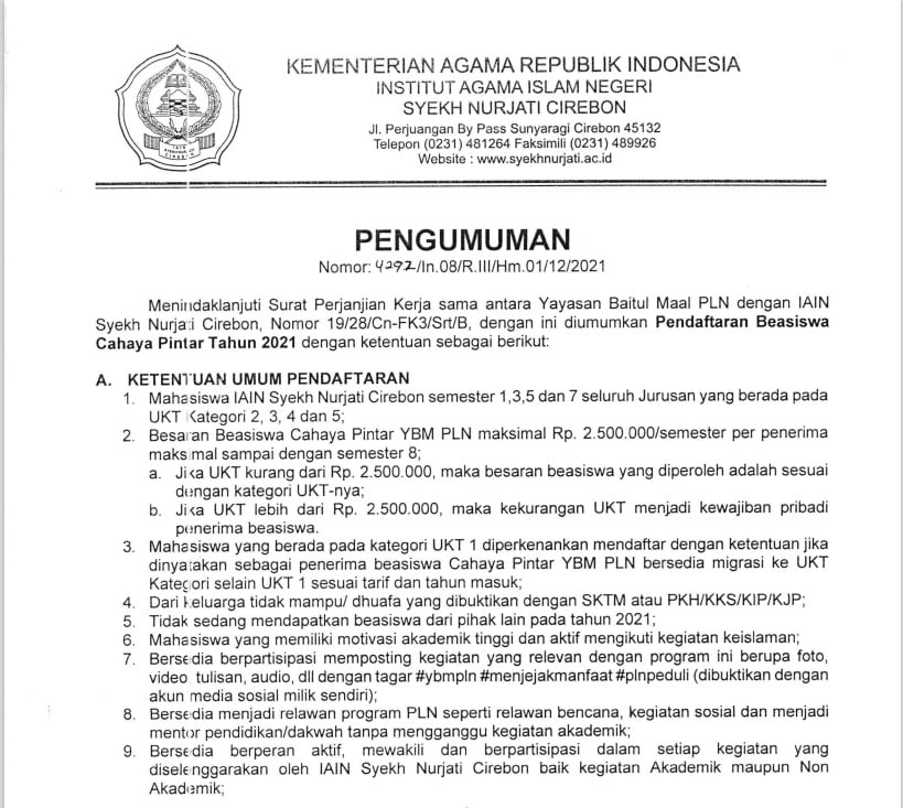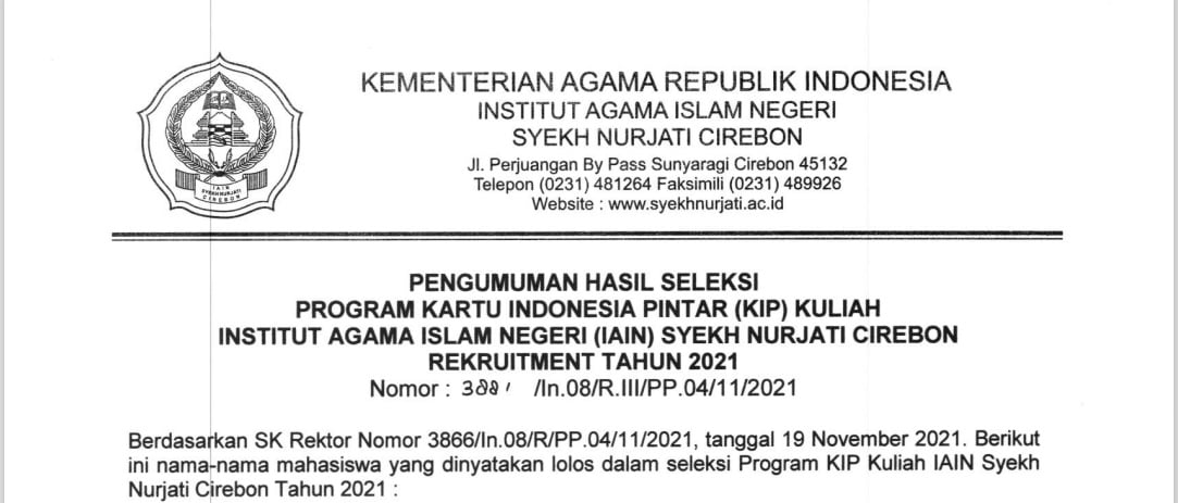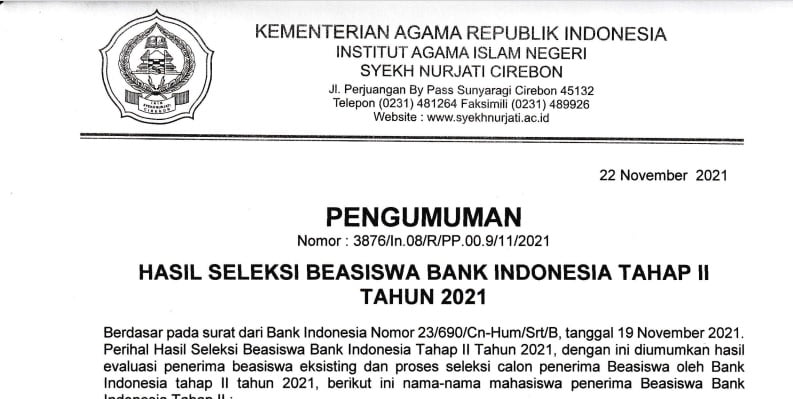 4 November 2021 • Pengumuman Hasil Seleksi Program Beasiswa Prestasi Non-Akademik Tahun 2021 IAIN Syekh Nurjati Cirebon Download Pengumuman Dibawah ini: 3612 pengumuman hasil seleksi Berita Pengumuman