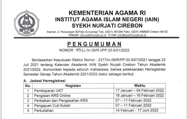 17 January 2022 • Pengumuman Pembayaran UKT IAIN Syekh Nurjati Cirebon Tahun 2022 Unduh Pengumuman PENGUMUMAN PEMBAYARAN UKT SMT GENAP 2021-2022 Pengumuman