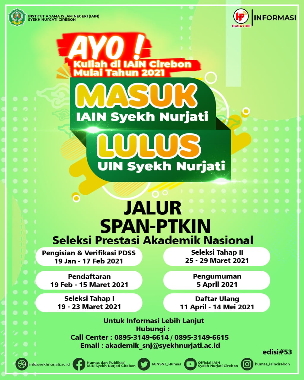 16 February 2021 • AYO KULIAH DI IAIN SYEKH NURJATI CIREBON, MASUK IAIN CIREBON, LULUS UIN CIREBON Kunjungi Twibbon https://www.twibbonize.com/twibbonpromosiuinsyekhnurjati Berita Informasi Pengumuman
