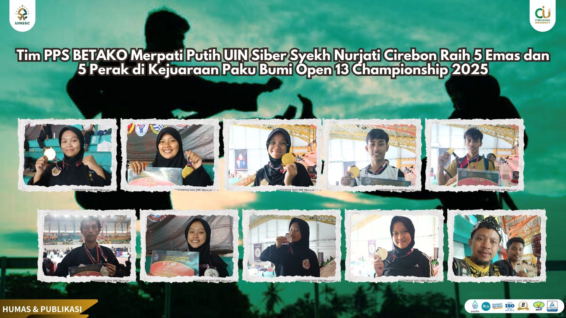 31 January 2025 • Tim PPS BETAKO Merpati Putih UIN Siber Syekh Nurjati Cirebon Raih 5 Emas dan 5 Perak di Kejuaraan Paku Bumi Open 13 Championship 2025 UIN Siber Cirebon (Bandung) – Prestasi membanggakan kembali diraih oleh Tim PPS BETAKO Merpati Putih... Berita Kegiatan Pojok Rektor