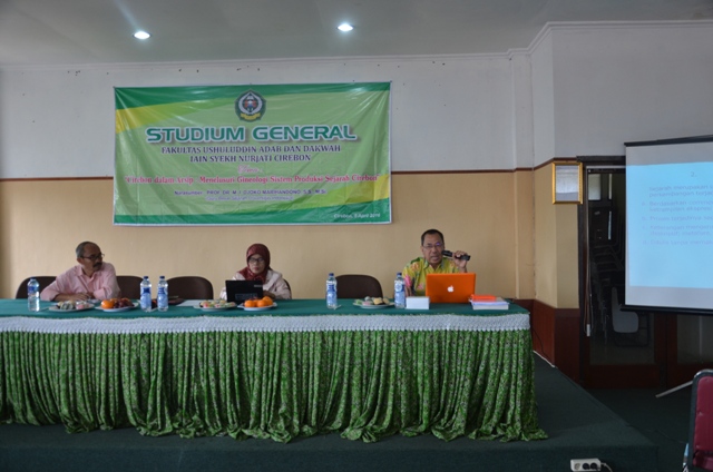 Selasa, 5 April 2016 di Gedung Rektorat lt.3 Fakultas Ushuluddin Adab Dakwah (FUAD) IAIN Syekh Nurjati Cirebon melaksanakan kegiatan Studium General dengan mengangkat tema ” Cirebon Dalam Arsip; Menelusuri Gineologi Sistem Produksi Sejarah Cirebon “, menurut Dr. Anwar Sanusi, M. Ag selaku penanggungjawab kegiatan dalam Studium General kali ini Fakultas Ushuluddin Adab Dakwah IAIN Syekh Nurjati CIrebon menghadirkan Narasumber dari salah satu Guru Besar Sejarah Universitas Indonesia Jakarta yaitu Prof. Dr. M.I. Djoko Marihandono, S.s., M. Si. panitia Studium General telah menyebarkan undangan sebanyak 160 orang peserta