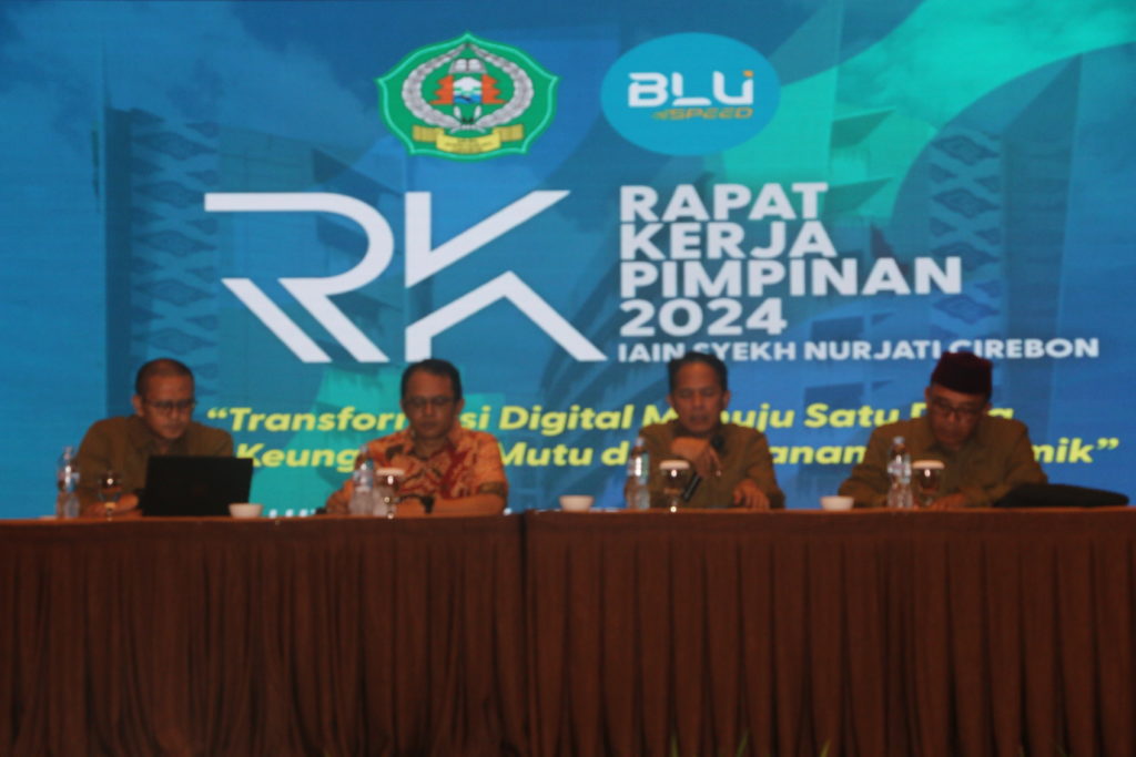 IAIN Cirebon – Rapat Kerja Pimpinan (Rakerpim) IAIN Syekh Nurjati Cirebon hari kedua (Sabtu, 2 Maret 2024) diisi dengan sebuah perbincangan penuh energi dan inspirasi dengan staf khusus Kementrian Agama RI bidang IT H Wibowo Prasetyo didampingi Prof Dr H Aan Jaelani, M.Ag., Prof Dr H Jamali, M.Ag., dan dipandu oleh Lala Bumela Sudiamtara, Ph.D. sebagai moderator.