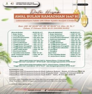 UIN Siber Cirebon — Menyambut datangnya bulan suci Ramadhan 1447 Hijriah, Laboratorium Ilmu Falak Fakultas Syariah UIN Siber Syekh Nurjati Cirebon resmi merilis data hisab awal Ramadhan berdasarkan titik perhitungan di Pusat Laboratorium Ilmu Falak, Jl. Saladara Majasem, Kota Cirebon. Rilis ini menjadi bagian dari kontribusi akademik kampus dalam memberikan edukasi astronomi Islam kepada masyarakat luas.